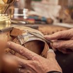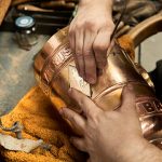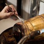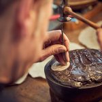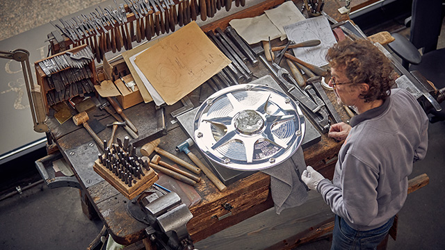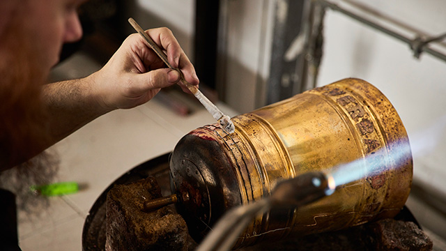 Bei figürlich verzierten Objekten folgt das Ziselieren, bei dem die Reliefformen auf Kitt getrieben werden.