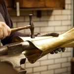 Die Formgebung beginnt mit dem Ausschneiden nach Schablone. Danach wird das Metall auf vorhandene Holz- oder Stahlfutter gedrückt oder ein neues Drückfutter angefertigt.